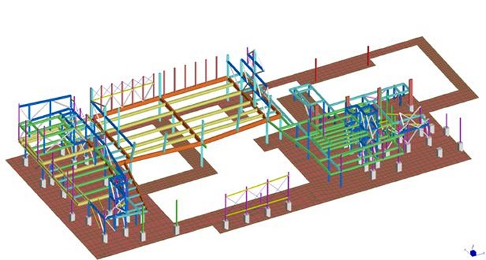 Le elevazioni sono a telaio con controventi a croce e controventi a “V”. Le colonne sono in profili HEM220, HEM300, tubi 200x200x12, tubi 150x150x12.5 . I controventi sono in profili UPN180 singoli quando sono a croce, ed UPN180 doppi quando sono a “V”. Quando a vista, i controventi sono in fune d’acciaio diametro 20mm. Gli impalcati sono a graticcio di travi HEA300, HEA340, HEA550 e HEB800. Nella figura sopra si colgono in colore azzurro le colonne HEM300, in colore blu le colonne HEM220, in colore rosso e verde le colonne in tubi 200x200x12mm. I controventi UPN180 sono in grigio. Le travi di impalcato HEA300 sono in azzurro, le HEA340 in verde, le HEA550 in giallo e le HEB800 in arancione Gli impalcati hanno lamiera grecata con getto collaborante in calcestruzzo armato; le travi sono tutte piolate. |