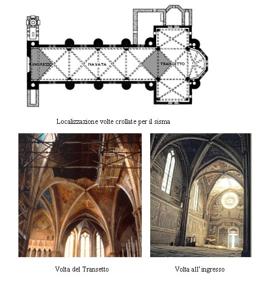 La scossa principale, di 7.5° MCS, delle ore 11.40, preceduta da molte altre nella notte, ha provocato i danni maggiori nella Basilica Superiore, dove sono crollate le vele della volta all’ingresso, con gli affreschi di S. Girolamo e quelle in corrispondenza del transetto, con le figure di S. Matteo (Figura 1); molto danneggiate sono anche le altre volte a crociera con fenditure in chiave in direzione longitudinale che hanno provocato il distacco dell’intonaco affrescato; parzialmente crollato è anche il timpano nel lato sud del transetto.