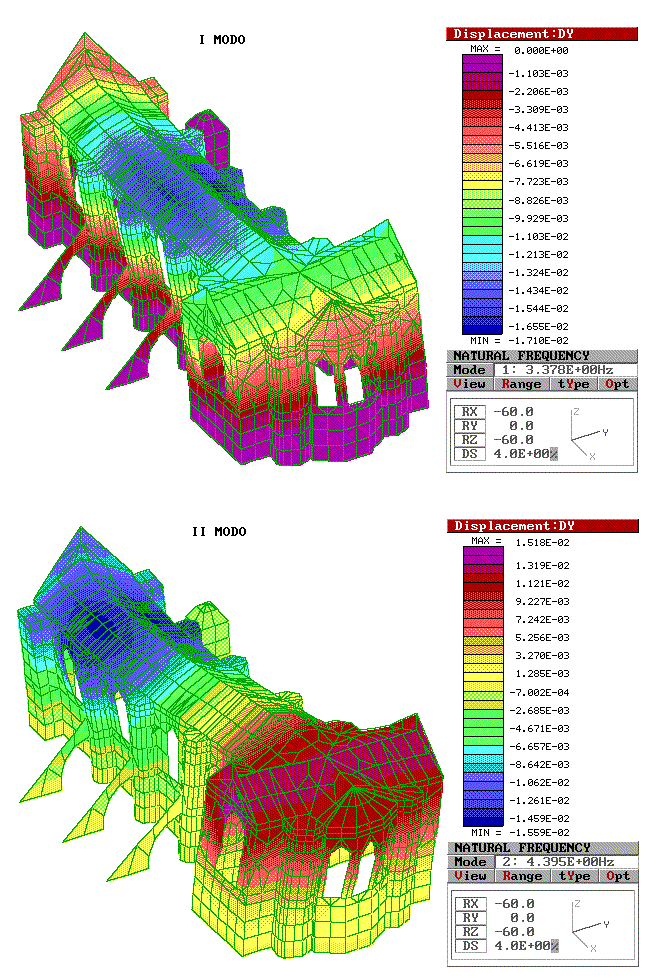 I risultati delle analisi condotti su diversi tipi di modelli e adottando diverse ipotesi sui materiali e sui vincoli, hanno mostrato un valore del primo periodo pari a 0,3 s; in particolare la deformata relativa al I modo (Figura 3), mostra una deformazione laterale della navata, che risulta essere meno rigida, nonostante i torrioni cilindrici e gli archi rampanti, rispetto alla facciata e al transetto, diversamente dal II modo che mostra una torsione della navata.