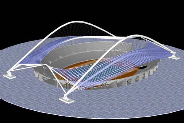che, accostate, lasciano libera in pianta una zona ellittica sopra il campo di calcio.