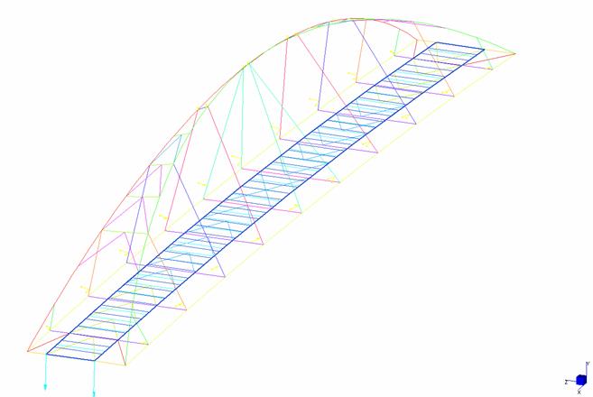 La figura rappresenta il modello di una passerella, realizzato in Straus7 utilizzando elementi tipo ‘beam’. Straus7 dispone di un ambiente di pre-processamento che consente di costruire in modo efficiente e veloce modelli quali quello di figura, e, attraverso il rendering, di verificarli.