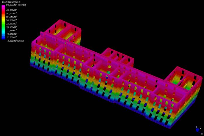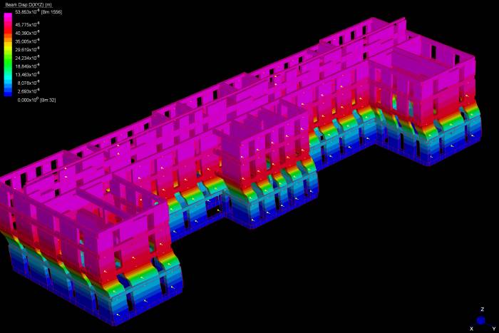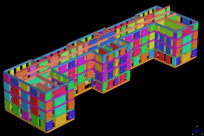 Il modello strutturale dell’edificio scolastico è stato effettuato mediante la modellazione con elementi beam dei maschi murari presenti