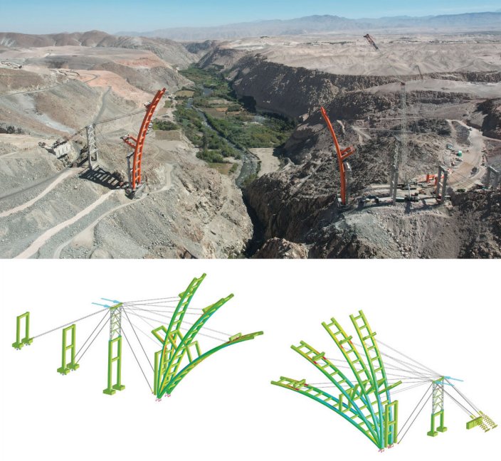 Nel sud del Peru' la Cimolai S.p.A. ha realizzato il nuovo ponte ad arco a via superiore in carpenteria metallica in prossimita' della citta' di Arequipa. L'arco, in tubo di diametro 2250mm, copre una luce da imposta a imposta di 175m, mentre con undici campate di 35m e 28m il viadotto superiore a sezione trapezia mista acciaio-cls, copre una luce di complessivi 371m. Mediante il software Straus7 e' stato eseguito il modello FEM globale a stage con elementi beam che ha permesso di verificare tutte le fasi di montaggio degli archi rampanti in verticale, della spettacolare pronazione degli stessi e del varo sempre per stage dell'impalcato metallico. Con la tecnica degli stages, nativa in Straus7 e qui utilizzata con solutore non lineare, e' stato possibile prevedere con precisione e poi riscontrare dal cantiere le deformate progressive con pieno controllo delle evolute delle sollecitazioni e delle tensioni. Il progetto dei numerosi dettagli e' stato condotto con modelli FEM locali realizzati mediante elementi plate, caricati con sollecitazioni estratte del modello globale grazie al tool "sub modeling". |