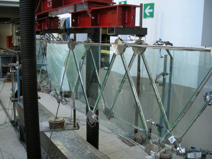 Vengono impiegati elementi in vetro stratificato di forma triangolare con i vertici arrotondati per assecondare i mutui movimenti tra vetro e metallo e limitare l’insorgere di tensioni localizzate. Il vetro sarà sottoposto al trattamento di tempera chimica perché questa tipologia di tempera è caratterizzata, in caso di rottura, da una frammentazione in grandi elementi in grado di donare alla struttura una capacità residua di portare i carichi come avviene per il vetro ricotto.