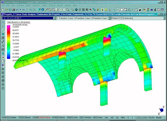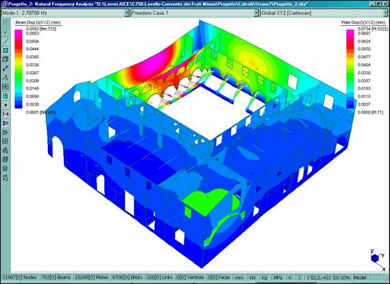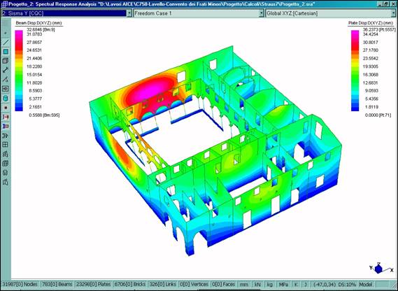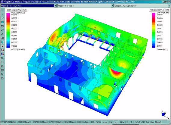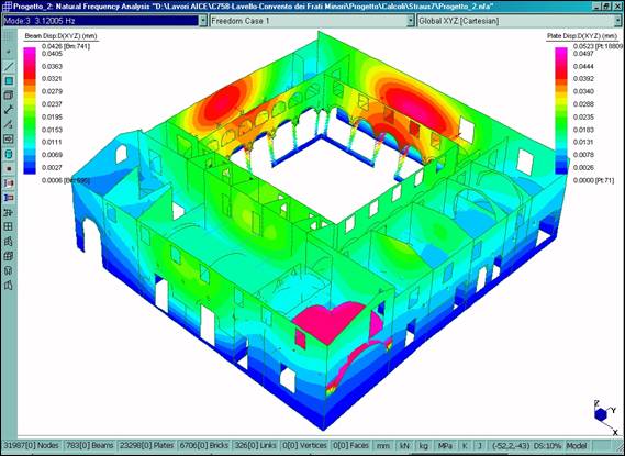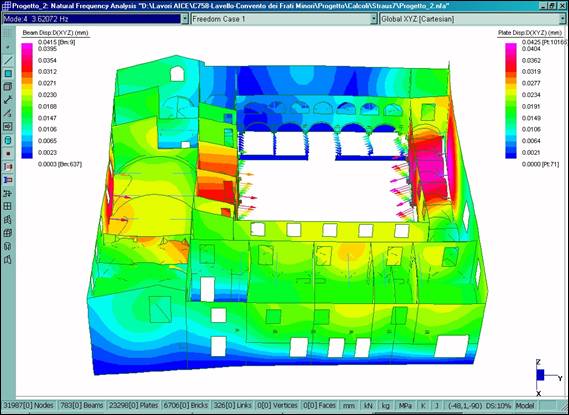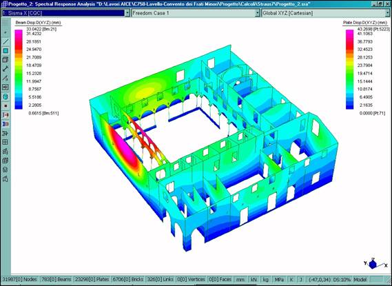 È stato definito un modello tridimensionale dell’intero fabbricato (Fig. 2–6), dotato di 31987 nodi, 783 elementi BEAM utilizzati per le colonne in pietra del chiostro dei tiranti in acciaio e per l’orditura lignea principale della copertura, 23298 elementi PLATE usati per le murature e 6706 elementi BRICK utilizzati per il rinfianco delle volte. Il legame costitutivo è stato definito in maniera differente per le diverse porzioni del manufatto, utilizzando opportunamente i tipi di materiale isotropo ed ortotropo.