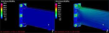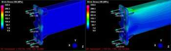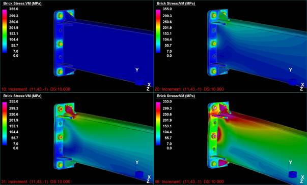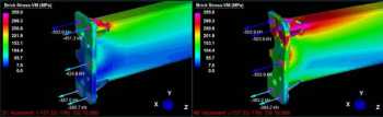 Le stazioni degli impianti di risalita di ultima generazione del Leitner Group, seggiovie e cabinovie ad ammorsamento automatico, denominate LPA, sono progettate e verificate come strutture intelaiate. In particolare il modello in Straus7 delle stazioni è realizzato perlopiù con elementi trave del tipo beam2. Alcuni dettagli costruttivi di particolare importanza o complessità sono studiati separatamente. I modelli FEM vedono l’uso di elementi plate, brick, e point contact beams, e sono risolti con linear buckling analysis e nonlinear static analysis È questo il caso del giunto trave-trave con flangia d’estremità e bulloni ad alta resistenza precaricati, realizzato nelle due travi longitudinali principali di stazione (tubi formati a caldo 500x300x16 in acciaio S355, piastre da 30mm in acciaio S355 , bulloni M30 cl.10.9 e spine f35 in acciaio 42CrMo4).
