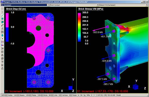 Punti di distacco flangia (in rosa a sinistra); forze sui bulloni (a destra)