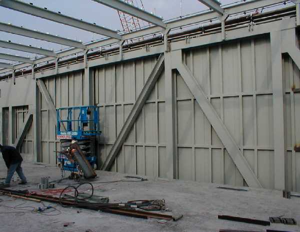 In corrispondenza delle aperture per le porte di ingresso, che impediscono il posizionamento di diagonali necessarie al funzionamento a trave reticolare, sono stati previsti pannelli irrigidenti in lamiera saldata che definiscono campi con funzionamento a trave tipo Vierendeel.