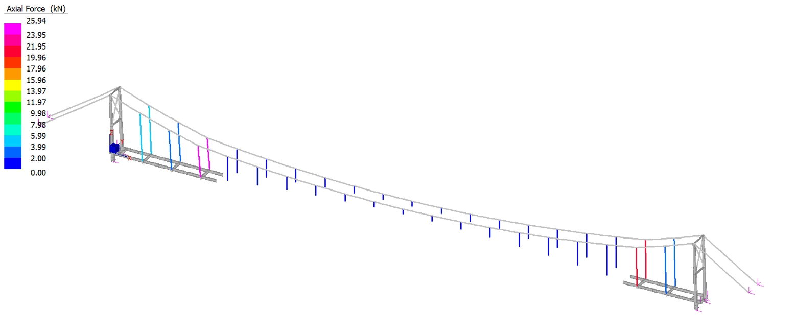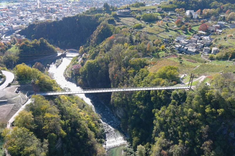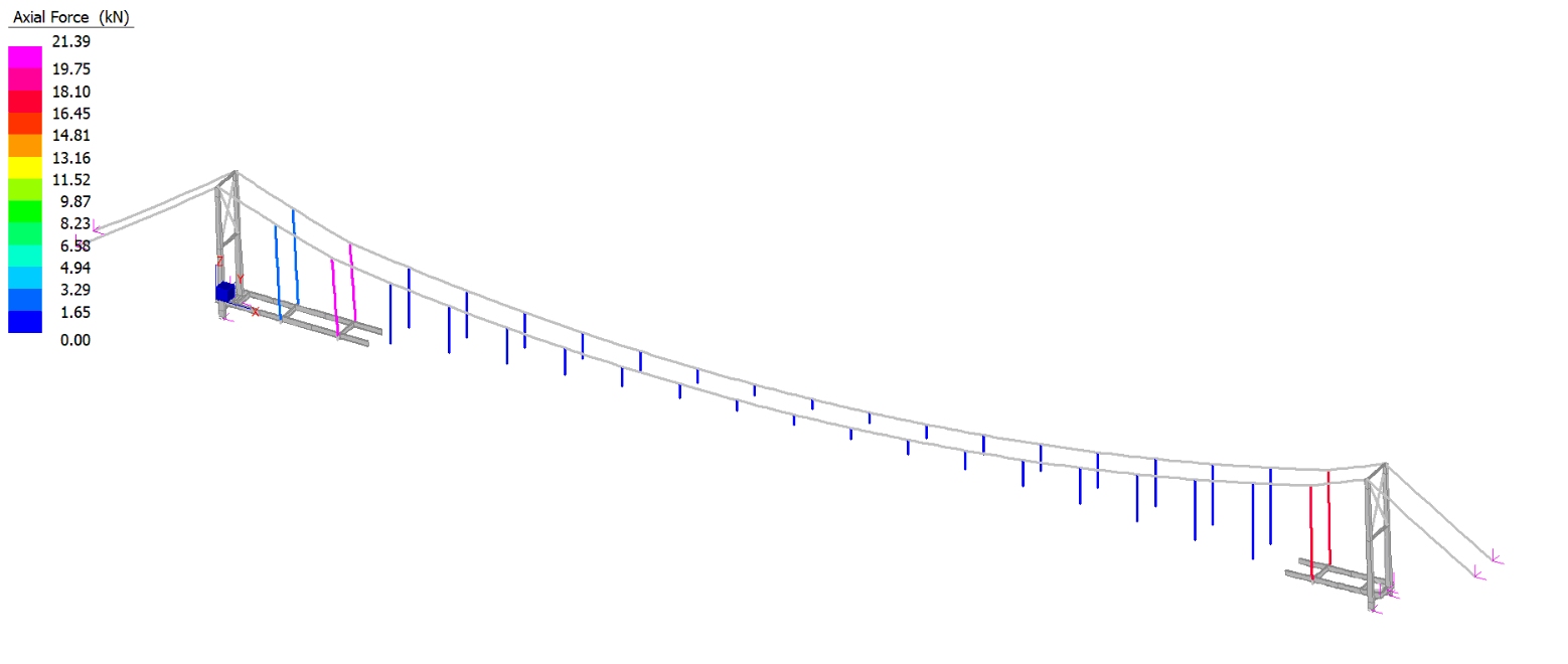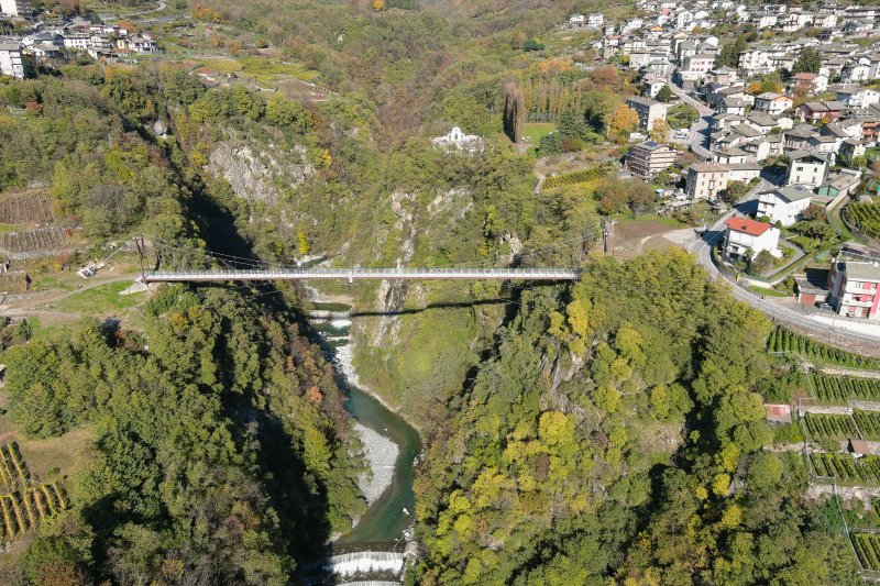 Sorge sospeso a 100 metri di altezza, sopra lo spettacolare orrido creato dal torrente Mallero in Valmalenco (SO), il ponte ciclopedonale che collega le localita' di Mossini e Ponchiera. L'opera commissionata dal Comune di Sondrio e' stata progettata da MAFFEIS ENGINEERING S.p.A., capogruppo del raggruppamento che comprende Studio Moncecchi Associati, Arch. Francesco Venzi e Se.i.co. e realizzata da C.M.M. F.lli Rizzi s.r.l. Durante tutto l'iter progettuale, che il raggruppamento ha seguito dal preliminare all'esecutivo, si sono indagate in modo approfondito tutte le specificita' di una struttura di questo tipo, soggetta alle azioni dinamiche indotte dal vento oltre che alla problematica del comfort della folla in attraversamento. L'architettura strutturale del ponte e' di tipo tensostrutturale, ovvero una passerella sospesa con funi superiori portanti principali e funi stabilizzanti inferiori secondarie. L'opera ha una luce di attraversamento di circa 146 mt ed una larghezza calpestabile di 2.90 mt. La struttura portante e' costituita da un impalcato in struttura metallica (costituito da due travi principali a doppio T ad anima inclinata) e soletta in calcestruzzo. L'impalcato e' connesso alle funi portanti mediante una pendinatura avente un passo di circa 7.20 mt. Al fine di ottenere una struttura stabile anche per le azioni laterali dovute al vento, sono state messe delle funi stabilizzanti disposte secondo una configurazione spaziale, inizialmente in equilibrio sotto le azioni di tensione iniziale dovute ai carichi permanenti. Il sistema di sospensione e' realizzato con funi costituite da fili di acciaio ad alta resistenza zincati a caldo. Sia le funi portanti (agganciate ai piloni alti 16 mt) sia i cavi stabilizzanti sono funi chiuse FLC, mentre le pendinature sono realizzate con funi spiroidali; i cavi portanti principali hanno un diametro di 80-84 mm, gli stabilizzanti 56 mm e le pendinature tra i 16 e i 20 mm. Le funi stabilizzanti sono caratterizzate da curvature nei piani verticali e orizzontali in modo da ottenere una risposta efficace contro le azioni dei carichi gravitazionali e le azioni di sollevamento e trascinamento indotte dal vento. E’ stato realizzato un modello FEM di calcolo Straus7 comprensivo di antenne, impalcato e cavi, non solo per il calcolo degli stati di esercizio, ma anche per la simulazione, tramite stage analysis di tutte le fasi di montaggio del ponte, permettendone la supervisione e il monitoraggio. Il modello e' stato realizzato mediante un approccio parametrico, mediante interfaccia Rhinoceros-Grasshopper resa possibile per mezzo di un codice personalizzato realizzato con l'opzione API (Application Program Interface) di Straus7. Testo, foto e immagine del modello di calcolo per gentile concessione di Maffeis Engineering Spa. |