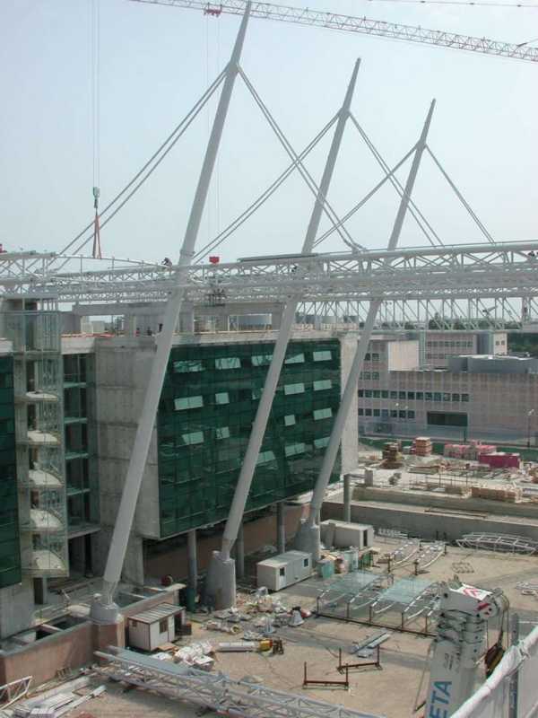 Ogni trave principale appoggia sui corpi dell’ edificio e, nella parte mediana, è sostenuta da due piloni d’acciaio a sezione tronco-conica che, inclinati di 71.34° rispetto l’orizzontale, raggiungono la quota + 44.55 m.