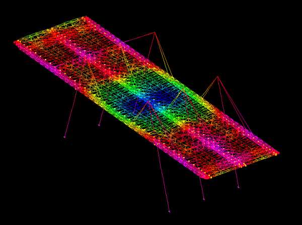 La struttura portante è costituita da un graticcio di travi in acciaio, in cui si può leggere un’orditura principale di travi reticolari con sezione a cassone, poggianti alle estremità sui due corpi dell’edificio e nella parte mediana sui due pennoni strallati, e una secondaria di capriate reticolari piane.