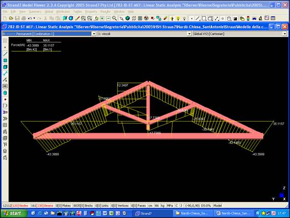 Fig. 4 – Analisi statica lineare: forza assiale N nelle aste di una capriata.