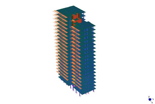 Il modello della torre è stato anche analizzato nel suo insieme con analisi della frequenza, per cercare le frequenze proprie di vibrazione.