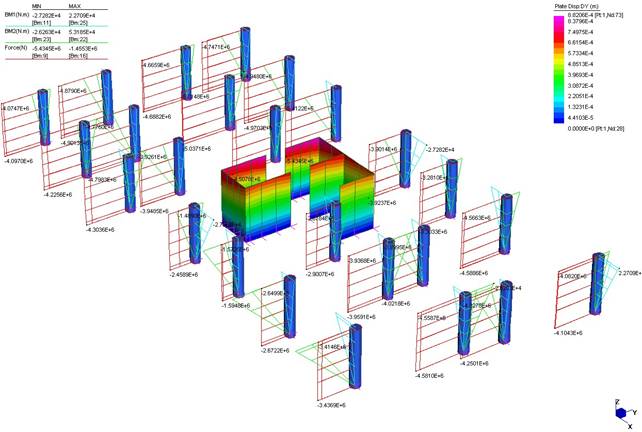 La platea è stata modellata con elementi finiti shell con supporto dovuto al terreno e vincoli fissi in corrispondenza delle colonne in jet-grouting.