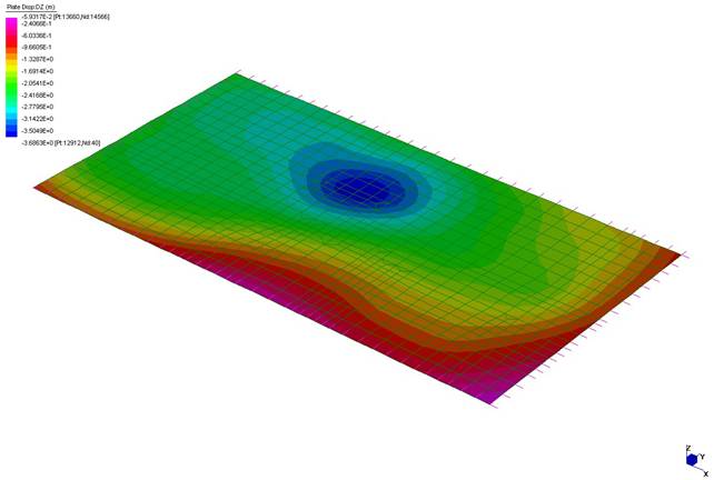 Per questo la platea è stata modellata con elementi finiti shell con supporto dovuto al terreno con Kw=100 Mpa/m (10 kg/cm3).
