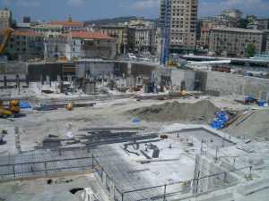 L’uso della platea è reso necessario anche dalla presenza d’acqua, poiché il piano d’imposta dei garages sarà a –5.40 metri sotto il livello del mare; sarà necessario realizzare un’opportuna impermeabilizzazione e struttura in grado di reggere la sottospinta idraulica pari a 5900 kg/m2.