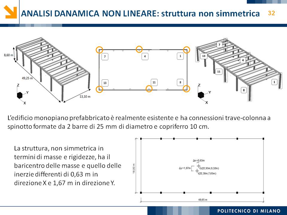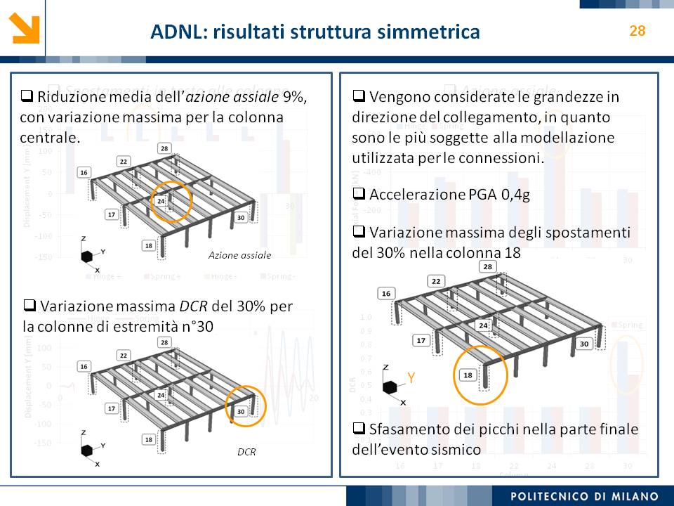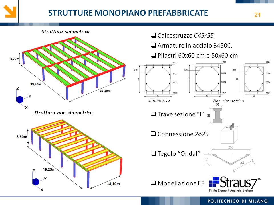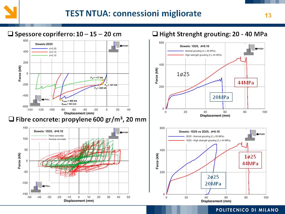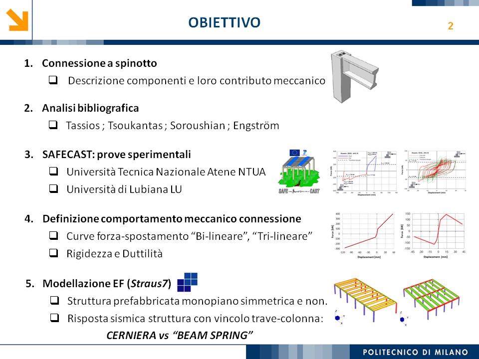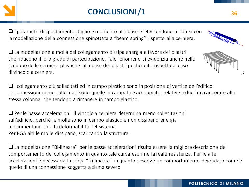 L’obiettivo dello studio presentato è qualificare e quantificare i parametri caratteristici del comportamento sismico, in termini di spostamento, resistenza, rigidezza e duttilità, delle connessioni a spinotto trave – colonna correntemente impiegate nelle strutture industriali prefabbricate. Queste connessioni sono tipicamente costituite da barre di acciaio ancorate nel pilastro e passanti in appositi alloggiamenti della trave, successivamente annegati con malta, in modo da garantire un comportamento pressoché a cerniera nel piano verticale e un comportamento rigido nel piano orizzontale. Nella tesi è riportata un’analisi parametrica relativa alle formulazioni attualmente presenti in letteratura per la valutazione della resistenza di tali connessioni, al fine di sottolineare pregi e difetti di ognuna. Viene inoltre presentata la procedura necessaria a caratterizzare il comportamento del collegamento in termini di forza-spostamento, sia a snervamento sia a rottura, mediante curva “Bi-Lineare” e “Tri-Lineare”. Tali procedure sono verificate attraverso una campagna sperimentale, realizzata nell’ambito del progetto di ricerca Europeo SAFECAST, di cui si riportano i set up delle prove e i risultati ottenuti per storie di carico sia monotono sia ciclico; i test sono stati condotti fino allo spostamento ultimo, in modo da determinare, in maniera dettagliata, la curva forza-spostamento caratterizzante la connessione. La definizione “Bi-Lineare” e “Tri-lineare” del comportamento del collegamento spinottato è stata applicata nella modellazione ad elementi finiti di due strutture prefabbricate monopiano ad uso industriale, simmetrica e non, realmente esistenti. Su tali strutture sono state condotte analisi dinamiche non lineari, Time History, al fine di evidenziare la differente risposta, da parte dell’edificio soggetto a sisma, tra l’innovativa modellazione della connessione spinottata con elementi “Beam Spring” e il classico vincolo a semplice cerniera, attualmente adottato nella comune pratica progettuale. Lo studio presentato cerca di colmare le lacune nella conoscenza del comportamento sismico delle connessioni spinottate trave-colonna, promuovendo lo sviluppo di strumenti numerici appropriati, attendibili e verificati sperimentalmente, da utilizzare nella progettazione di strutture prefabbricate in zone sismica sfruttando le proprietà delle stesse connessioni. Il software utilizzato per le modellazioni FEM e' il codice di calcolo Straus7. |