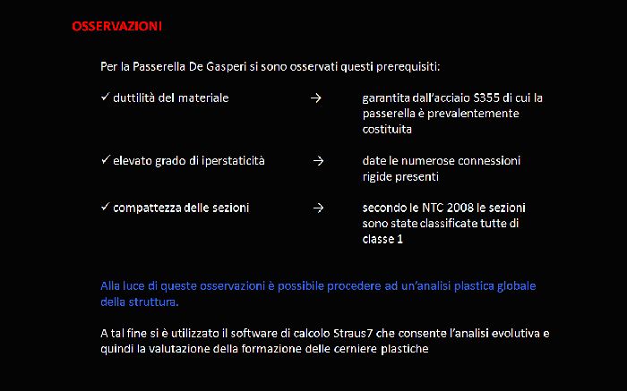 Alla luce delle più recenti normative nazionali ed europee, vengono introdotte ed analizzate le metodologie di calcolo plastico a rottura previste in sede normativa. In aggiunta ai più didattici metodi di calcolo rigido-plastico (metodo cinematico) ed elasto-plastico (metodo evolutivo) vengono introdotte le possibili analisi elasto-plastiche non-lineari incrementali, condotte per mezzo di codici di calcolo ad elementi finiti, ed applicate in particolare per sistemi strutturali a geometria complessa e forma non regolare. Lo studio è stato applicato al complesso metallico denominato “passerella De Gasperi” di Milano (Progettista Esecutivo dell’opera: società ARUP ITALIA S.R.L.), sistema di luce 60 m attualmente in realizzazione, di forma non regolare, indagando dapprima l’idoneità normativa per l’applicabilità del calcolo plastico globale secondo EN1993-2005 ed NTC2008, e procedendo poi all’estrazione degli effettivi moltiplicatori critici di collasso plastico. Le analisi numeriche sono state condotte per mezzo del codice FEM Straus7 solutore non-lineare per geometria e materiale, con specifici requisiti di accoppiamento assial-flessionale nella risposta del materiale e progressiva formazione di elasto-plasticità nella sezione. |