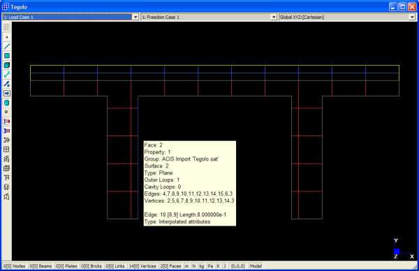 La seguente immagine mostra la geometria importata in ambiente Straus7. Si nota che le superfici importate sono diverse in relazione ad un differente materiale per il tegolo e la soletta di ripartizione.
