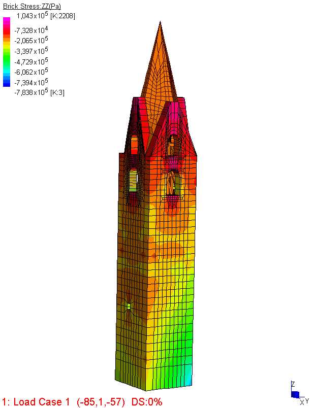 Per lo studio degli effetti delle forze orizzontali dovute all’oscillazione delle campane è stato realizzato un modello agli elementi finiti tridimensionale del campanile con elementi Brick simulanti la muratura e con elementi Beam rappresentanti la struttura in legno che sorregge le campane stesse.
