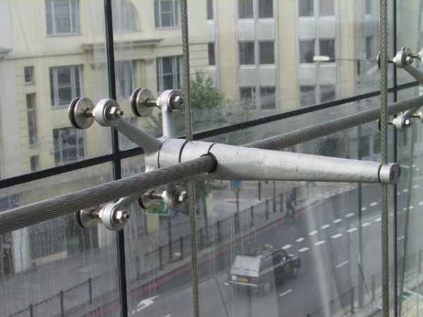 La tipologia a lastre sospese (fig. 1), invece, ha una diversa modalità di trasmissione dei carichi: il peso di ogni elemento di vetro, infatti, viene sostenuto, tramite appositi dispositivi detti “ragni” (fig. 2),