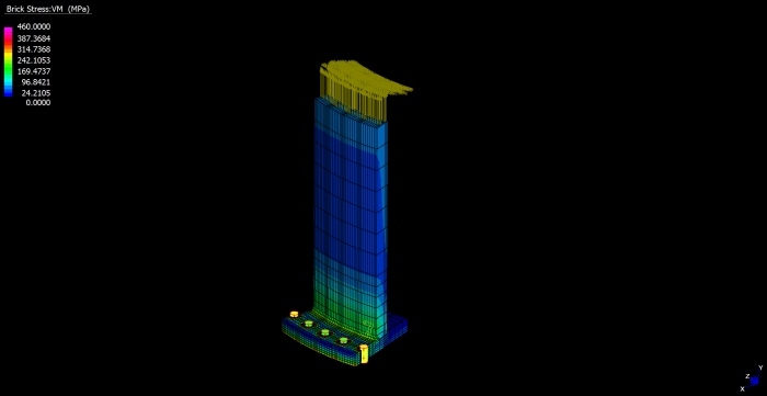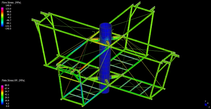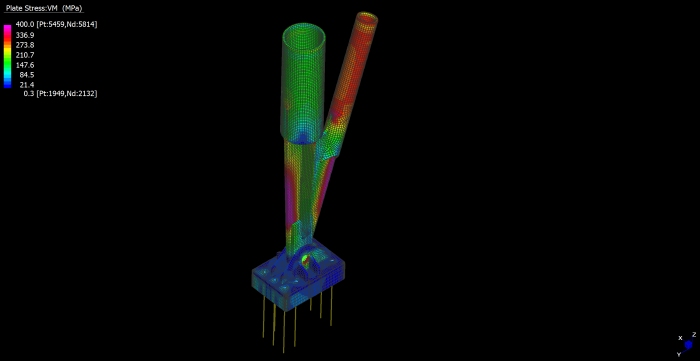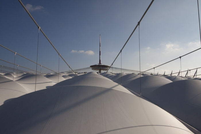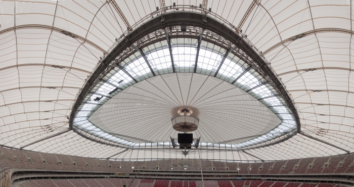 Il nuovo stadio nazionale di Varsavia ha una capienza di 55.000 posti a sedere. La copertura, del peso complessivo di 15.000 tonnellate, e' una tensostruttura sull'intera superficie, completamente ancorata dall'esterno mediante un meccanismo a sviluppo circolare formato da 72 colonne (profilo CHS 1016mm x 30-70mm) disposte in pianta lungo una circonferenza di 300 metri di diametro, un anello di contrasto detto compression ring (profilo CHS 1820mm x 80mm), pennoni di appensione dei cavi, detti inclined struts (profilo CHS da 1200 a 600mm x 35-45mm), contrasti di ancoraggio esterno, detti facade tie (profilo CHS 508mm x 20-50mm). La copertura vera e propria e' realizzata mediante un doppio ordine di cavi radiali (72 superiori di diametro 70-140mm e 72 inferiori di diametro 70-150mm) che, partendo dal perimetro esterno della struttura, convergono verso il centro e si ancorano sul mozzo centrale, detto centerspire. Il centerspire e' sospeso sulla verticale di centrocampo, ha una sezione tubolare di dimensione variabile da 1600x25mm a 300x5mm, ha un'altezza di 70m e pesa 200t. Lungo il fusto del centerspire sono ancorati il cosiddetto garage ed il video cube. Il garage e' la struttura a forma di pagoda circolare che contiene la membrana retraibile di copertura, movimentata da quattro argani quando il tetto e' in posizione chiusa. Il video cube e' la struttura di supporto dei maxischermi. E' costituito da 4 bracci reticolari disposti a croce. Ciascun braccio sostiene uno schermo del peso di 8t. |