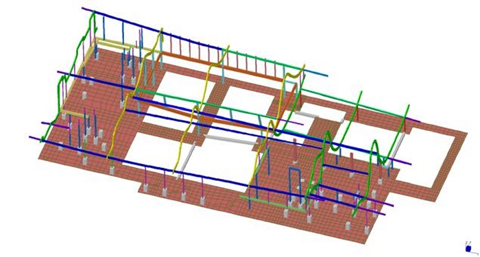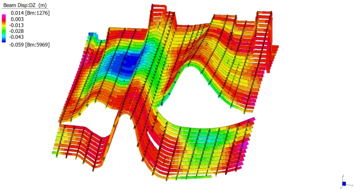 Le elevazioni sono a telaio con controventi a croce e controventi a “V”. Le colonne sono in profili HEM220, HEM300, tubi 200x200x12, tubi 150x150x12.5 . I controventi sono in profili UPN180 singoli quando sono a croce, ed UPN180 doppi quando sono a “V”. Quando a vista, i controventi sono in fune d’acciaio diametro 20mm. Gli impalcati sono a graticcio di travi HEA300, HEA340, HEA550 e HEB800. Nella figura sopra si colgono in colore azzurro le colonne HEM300, in colore blu le colonne HEM220, in colore rosso e verde le colonne in tubi 200x200x12mm. I controventi UPN180 sono in grigio. Le travi di impalcato HEA300 sono in azzurro, le HEA340 in verde, le HEA550 in giallo e le HEB800 in arancione Gli impalcati hanno lamiera grecata con getto collaborante in calcestruzzo armato; le travi sono tutte piolate. |