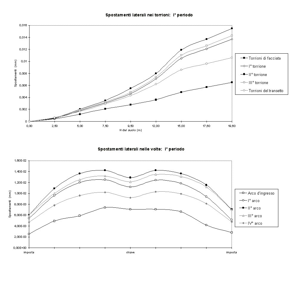 Questo si evidenzia bene dai 2 grafici (Figura 4) che riportano gli spostamenti laterali nei torrioni e in corrispondenza degli archi trasversali delle volte relativamente al I modo: sono gli elementi centrali della navata a subire gli spostamenti maggiori; inoltre si osserva che lo spostamento nei torrioni cresce linearmente fino ad un’altezza di 9,50 m (imposta delle volte), mentre poi tende a crescere maggiormente per la presenza del materiale di riempimento sopra le volte, fino a circa 15 m, per poi diminuire di inclinazione.