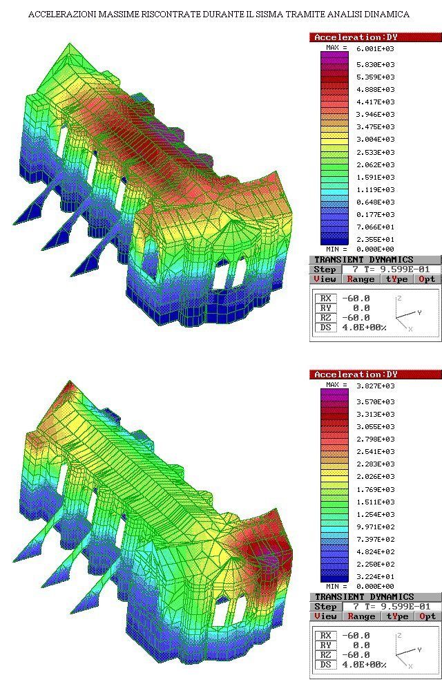 E stata svolta quindi una analisi dinamica sul modello tridimensionale, applicando come storia di carico gli accelerogrammi rilevati durante il sisma (Figura 6), per determinare il grado di sollecitazione nei punti più critici della Basilica, come l’imposta delle volte e gli archi trasversali che reggono le vele.