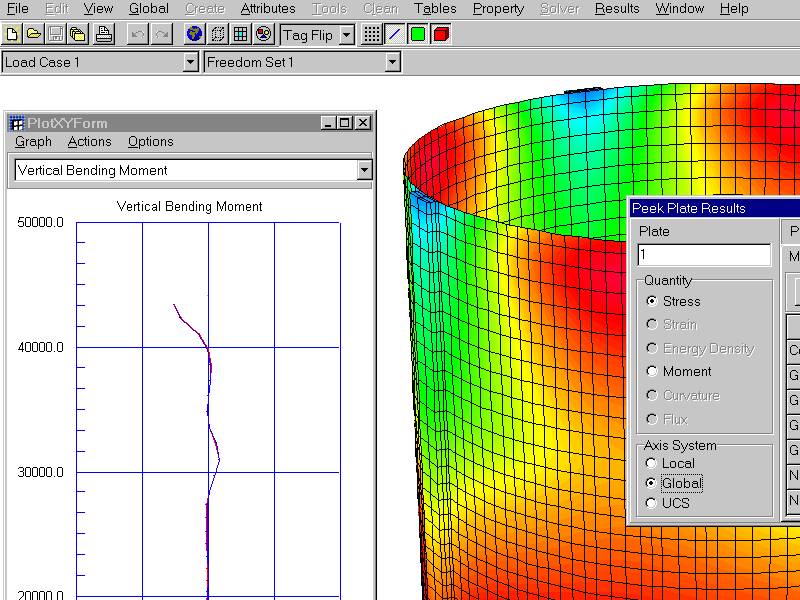 Straus7 vous donne un large choix de résultats. La visualisation par les cartes de contours, les cartes de vecteurs, les graphiques X-Y. L'outil 'Peek' vous permet de sélectionner et inspecter les résultats numériques en chaque point, directement sur le modèle. Vous pouvez afficher, éditer et filtrer les résultats avec les fonctions 'Result Listings' .
