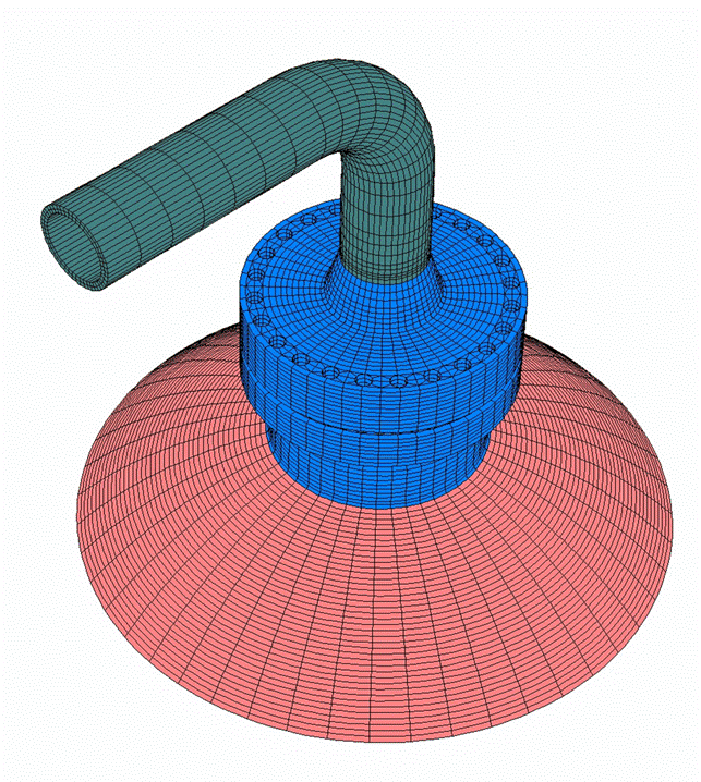 Metodologia di modellazione : stante le dimensioni degli spessori, necessariamente lo studio di tale componente strutturale ha richiesto una modellazione tridimensionale con utilizzo di elementi solidi. Considerazioni relative alla asimmetria della tubazione superiore nonché dei carichi esterni ad essa applicati hanno preferito tale soluzione alla modellazione in assialsimmetria.