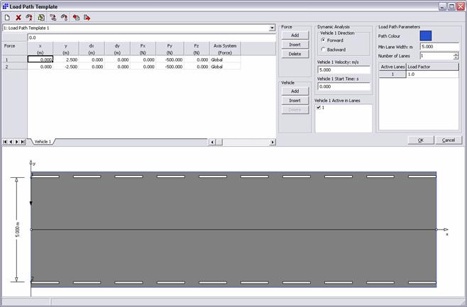 La finestra della Load Path Template permette di definire il riferimento stradale con un numero qualsiasi di carreggiate e di condizioni di carico. Per quest’ultime, definizioni standard possono essere lette direttamente da una libreria (con dati relativi a veicoli di vario tipo: automezzi, camion, bus, treni,..)