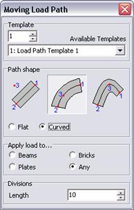 Il percorso seguito dal carico può essere rettilineo, ad arco di cerchio o segmento di parabola. Il percorso può, inoltre, avvenire in piano o seguire una curva. Nel caso in esame la passerella è arcuata, e, quindi, se sceglierà un percorso di carico curvo. Il load path è un modo molto semplice per definire le carreggiate ed i percorsi di carico: ma questi devono poi essere applicati al modello. L’associazione del carico agli elementi avviene automaticamente: occorre però decidere se si vuole che il carico venga applicato agli elementi beam, ai plate, ai brick od altro. Occorre anche definire, utilizzando il parametro Divisions come si vuole che sia frazionato il percorso.