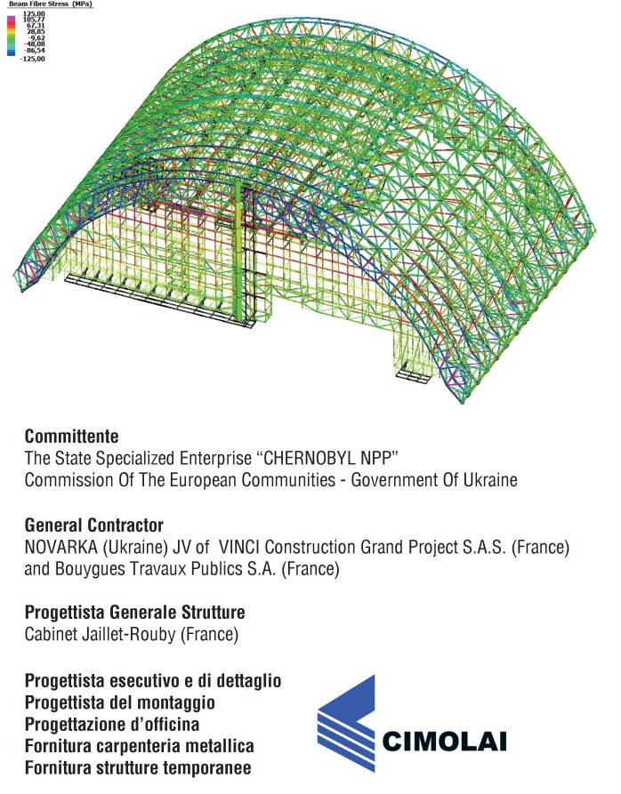 Con l'obiettivo di smantellare in sicurezza cio' che rimane del famigerato reattore n.ro 4 della centrale nucleare di Chernobyl e del sarcofago di protezione in calcestruzzo, e' stata realizzata una mega-struttura in acciaio ad arco reticolare spaziale (importo totale opera circa 1.5 mld di euro) che ospitera' un sofisticato sistema di carroponti comandati a distanza che effettueranno le operazioni di smontaggio senza l'intervento umano. La struttura in acciaio, del peso di 36000 tonnellate, e' rivestita a tenuta stagna e raggiunge i 105m di altezza, i 27m di larghezza e i 150m di lunghezza. In una zona adiacente a quella del reattore la mega-struttura e' stata costruita in due parti distinte di arco. La porzione di chiave dell'arco e' stata assemblata a terra e poi sollevata con torri provvisorie per poter installare 'le reni' di appoggio degli archi. Completata la prima parte, essa e' stata fatta traslare su di un sistema di binari in posizione provvisoria mediante un sistema di slitte e martinetti. Una volta liberata la zona di assiemaggio si e' proceduto alla costruzione della seconda parte e, unite le due, alla traslazione in posizione finale. I modelli di calcolo globali realizzati da CIMOLAI con Straus7 hanno simulato mediante l'utilizzo della tecnica a 'stages' tutte le fasi di costruzione a terra, sollevamento, inserimento reni, traslazione e collegamento delle due parti della mega-struttura. All'interno dei modelli di calcolo globali, realizzati a elementi beam e risolti con analisi elastica lineare, sono state inserite anche le attrezzature provvisorie (torri di sollevamento e tiranti provvisori per esempio) ed e' stato cosi' possibile verificare le aste a resistenza e stabilita' nonche' le deformazioni della strutture in tutte le fasi di montaggio. Le analisi di dettaglio dei nodi della reticolare spaziale sono state eseguite mediante modelli di calcolo a plate risolti con analisi non lineari (per materiale) ed hanno permesso la verifica funzionale di resistenza dei piatti di nodo e delle saldature.