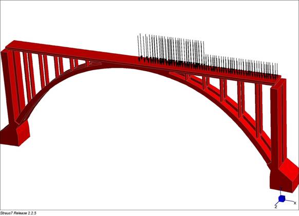La struttura è stata discretizzata mediante 19421 nodi e 11776 elementi solidi (brick) ad otto nodi. Si procede ad analizzare la risposta statica del ponte alle azioni permanenti ed indotte dai carichi accidentali relativi ai ponti di categoria RIV. A. Sono stati presi in considerazione gli effetti di una stesa di carico costituita da 2 locomotori che determinano un carico equivalente di 9,28 t/m e da un numero illimitato di carri del peso equivalente di 4,80 t/m.