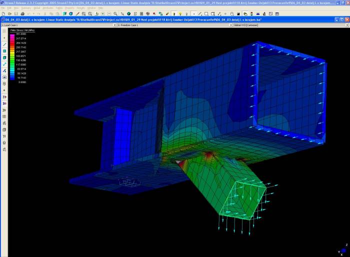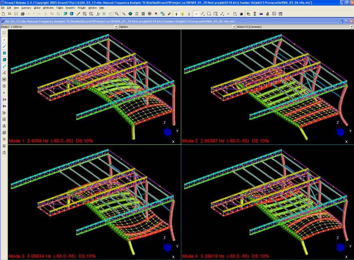 For the statical analysis of structure, a three-dimensional beam and plate model is made. The model contains all elements of the structure except the moving part of the roof, which is simulated by groups of concentrated forces.
