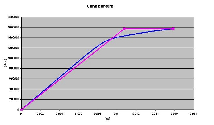 Nel grafico viene rappresentata la “curva di capacità” ridotta ad un sistema equivalente ad un grado di libertà alla quale si sovrappone la relativa “forma bilineare”.