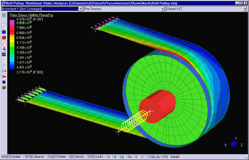 Puleggia e cinghia. Vengono modellati il contatto e l'attrito tra la cinghia e la puleggia. Si tratta di un problema fortemente non lineare, a causa della non linearità dell'attrito e del contatto. La cinghia è modellata come un elemento membrana che fornisce solo rigidezza a trazione. Grazie alla simmetria, è stato possibile modellare solo una metà del sistema.