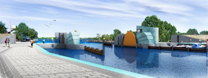E’ pertanto in costruzione una barriera anti-inondazione, simile a quella di Londra per il Tamigi, ma di dimensioni minori.