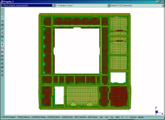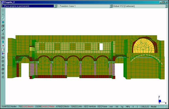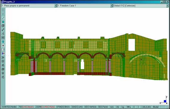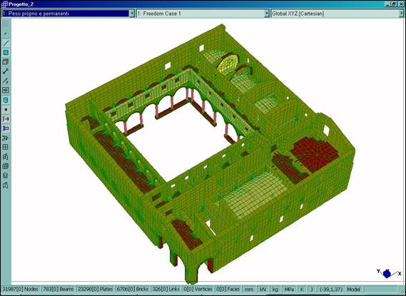 È stato definito un modello tridimensionale dell’intero fabbricato (Fig. 2–6), dotato di 31987 nodi, 783 elementi BEAM utilizzati per le colonne in pietra del chiostro dei tiranti in acciaio e per l’orditura lignea principale della copertura, 23298 elementi PLATE usati per le murature e 6706 elementi BRICK utilizzati per il rinfianco delle volte. Il legame costitutivo è stato definito in maniera differente per le diverse porzioni del manufatto, utilizzando opportunamente i tipi di materiale isotropo ed ortotropo.