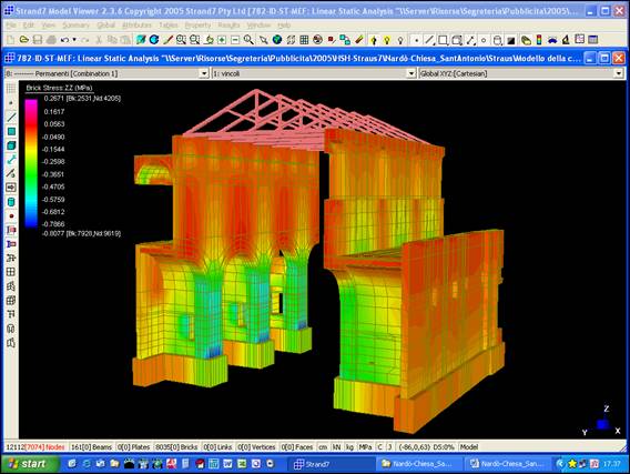 Si descrive nel seguito la modellazione ad elementi finiti della “Chiesa di Sant’Antonio da Padova sita in comune di Nardò (LE)”, eseguita per conto della Rettoria della chiesa, nell’ambito delle “Indagini diagnostiche relative al progetto di restauro conservativo e consolidamento statico del fabbricato” (anno 2004).