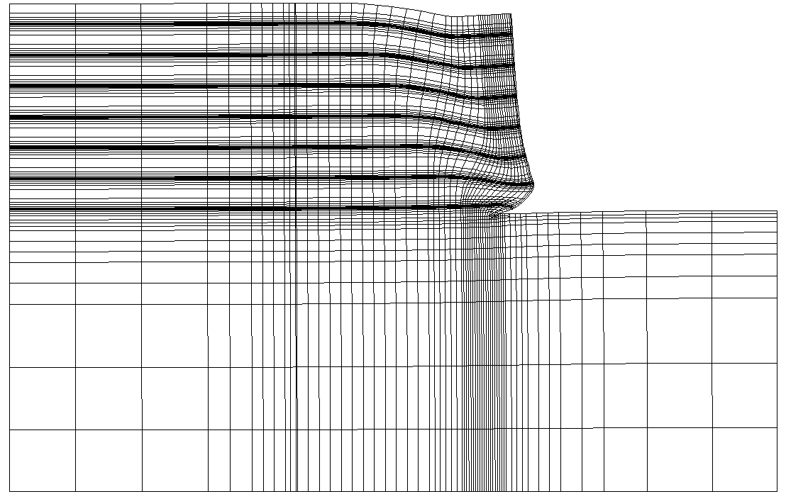 Quando si vuole modellare l’apertura di uno scavo in un terreno schematizzato come un mezzo elastico perfettamente plastico (come in questo caso), c’è il problema che il sollevamento del fondo dello scavo, che si osserva a seguito dello scarico tensionale, dipende dalla grandezza del continuo discretizzato (mesh-dipendenza). Nella realtà il terreno è un materiale incrudente e si comporta differentemente in carico e in scarico: il modulo elastico di scarico è circa 1/10 di quello di carico nel piano semilogaritmico delle tensioni. Il sollevamento del fondo scavo riscontrato nelle analisi numeriche (circa 6 cm) è eccessivo e induce una rotazione all’indietro dell’ammasso chiodato rendendo lo stato deformativo poco veritiero. In effetti si è verificato, attraverso un altro codice di calcolo agli elementi finiti (CRISP) e assumendo per il terreno un modello incrudente tipo CAM-CLAY, che il sollevamento del fondo scavo è molto minore (circa 1 cm) e coinvolge un volume di terreno pari a circa una volta l’altezza di scavo e non tutta la mesh.