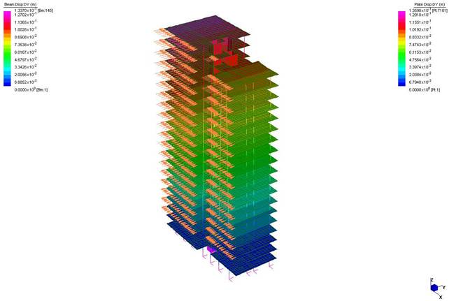 I solai sono stati modellati con elementi isoparametrici a 8 nodi a comportamento di piastra, così come i setti degli ascensori, tutti con gli effettivi spessori, opportunamente infittiti in corrispondenza di discontinuità di carico e di vincolo.