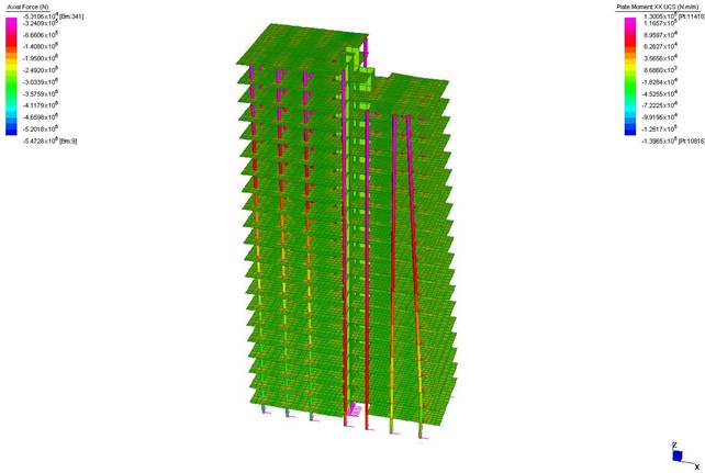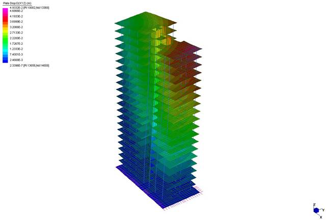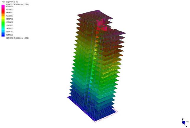Il modello della torre è stato anche analizzato nel suo insieme con analisi della frequenza, per cercare le frequenze proprie di vibrazione.