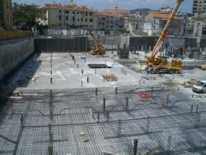 L’uso della platea è reso necessario anche dalla presenza d’acqua, poiché il piano d’imposta dei garages sarà a –5.40 metri sotto il livello del mare; sarà necessario realizzare un’opportuna impermeabilizzazione e struttura in grado di reggere la sottospinta idraulica pari a 5900 kg/m2.