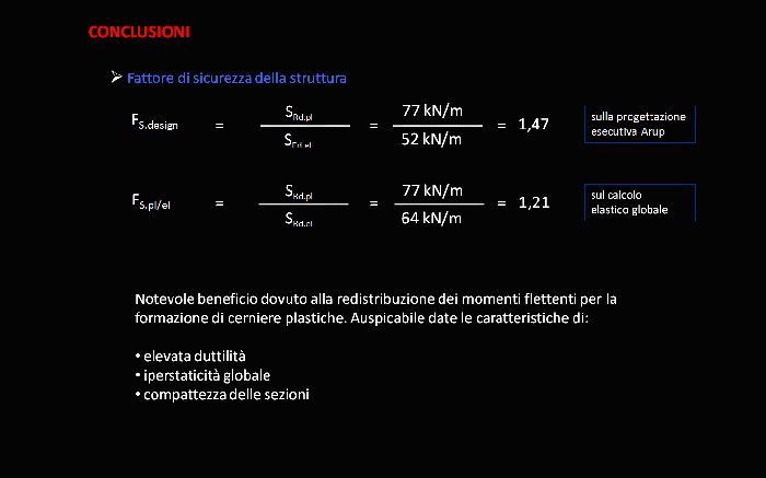 Alla luce delle più recenti normative nazionali ed europee, vengono introdotte ed analizzate le metodologie di calcolo plastico a rottura previste in sede normativa. In aggiunta ai più didattici metodi di calcolo rigido-plastico (metodo cinematico) ed elasto-plastico (metodo evolutivo) vengono introdotte le possibili analisi elasto-plastiche non-lineari incrementali, condotte per mezzo di codici di calcolo ad elementi finiti, ed applicate in particolare per sistemi strutturali a geometria complessa e forma non regolare. Lo studio è stato applicato al complesso metallico denominato “passerella De Gasperi” di Milano (Progettista Esecutivo dell’opera: società ARUP ITALIA S.R.L.), sistema di luce 60 m attualmente in realizzazione, di forma non regolare, indagando dapprima l’idoneità normativa per l’applicabilità del calcolo plastico globale secondo EN1993-2005 ed NTC2008, e procedendo poi all’estrazione degli effettivi moltiplicatori critici di collasso plastico. Le analisi numeriche sono state condotte per mezzo del codice FEM Straus7 solutore non-lineare per geometria e materiale, con specifici requisiti di accoppiamento assial-flessionale nella risposta del materiale e progressiva formazione di elasto-plasticità nella sezione. |