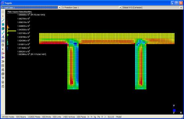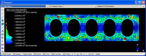 Gli elementi quadrangolari hanno fattori di forma assolutamente vicini all'unità (quadrato) per questo modello. In realtà la semplice geometria consente in questo caso di ottenere buoni risultati anche con procedure manuali.
