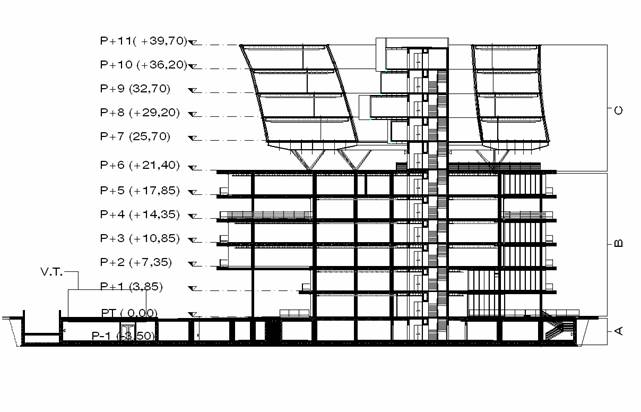 Trattasi di un edificio a destinazione uffici, di 11 piani  fuori terra più  uno interrato adibito a parcheggio la cui sezione schematica è sotto riportata.