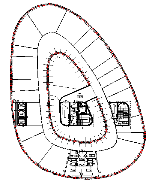Il corpo “C” in pianta sviluppa circa mq 900 secondo una geometria planimetrica curvilinea sotto descritta
